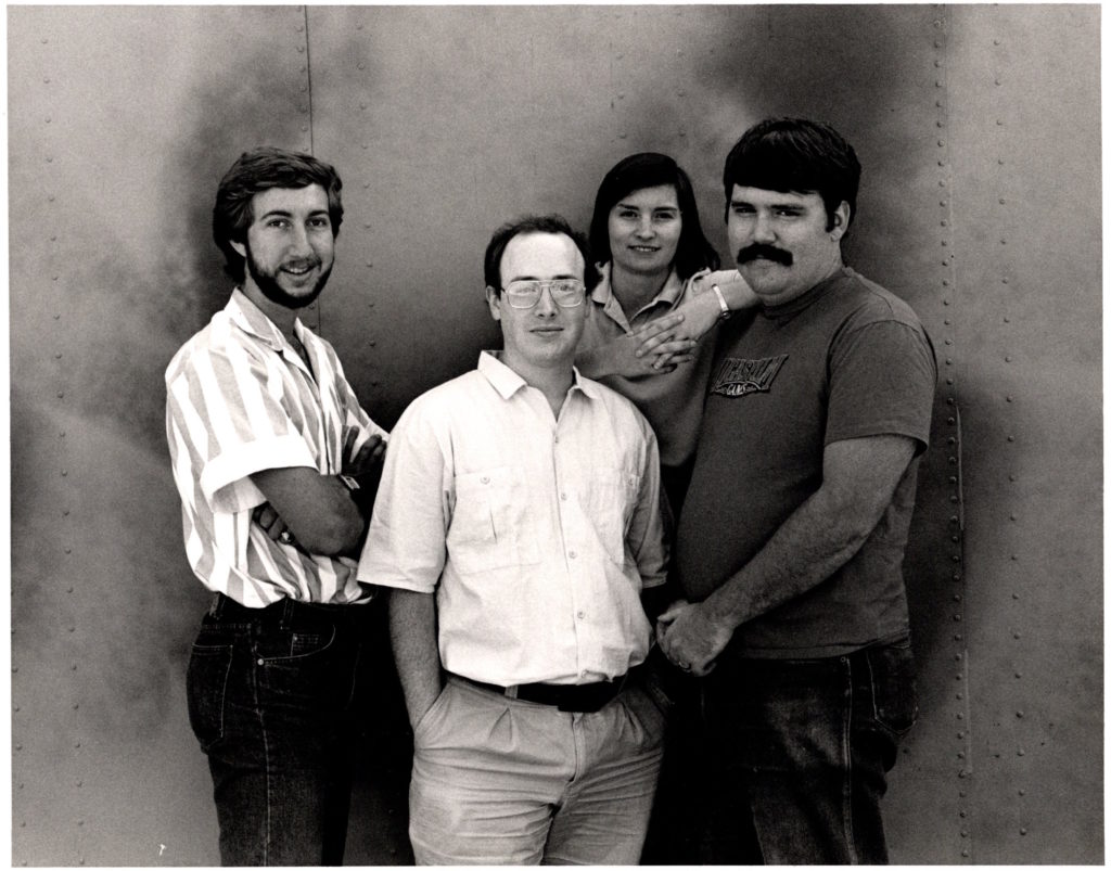 This is a publicity photo of the original Habitat programming team, taken next to a storage shed at Skywalker Ranch in 1987.
